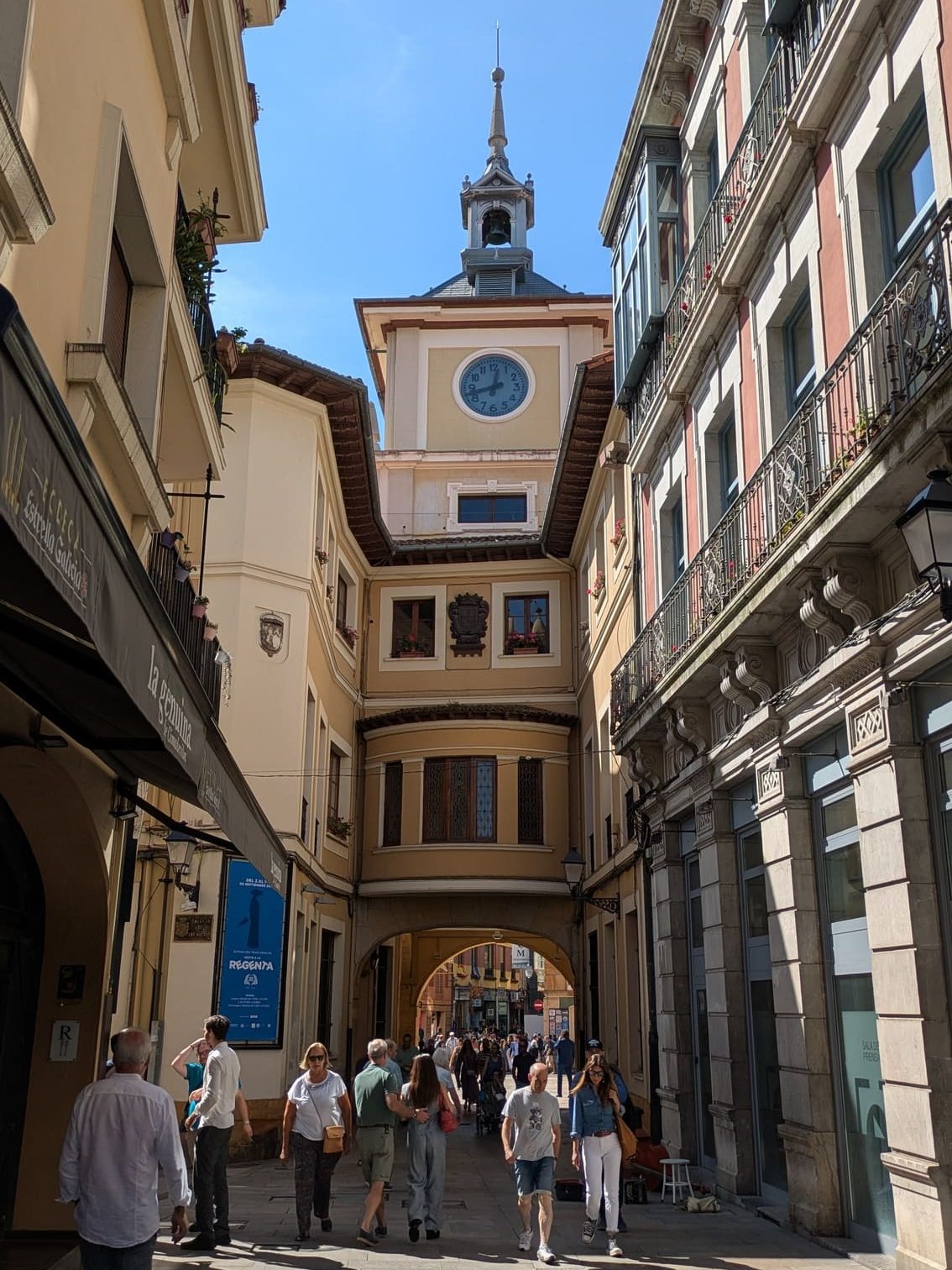 Está llena de bares con terraza -sí, todos tienen terraza-, todos ponen un pincho o tapita para acompañar a la consumición, y a pesar de no ver mucho el sol por estar enclavada entre edificios altos, su cercanía a las calles principales del centro hace que sea una de las primerísimas opciones para cerrar una mañana o una tarde en Oviedo.